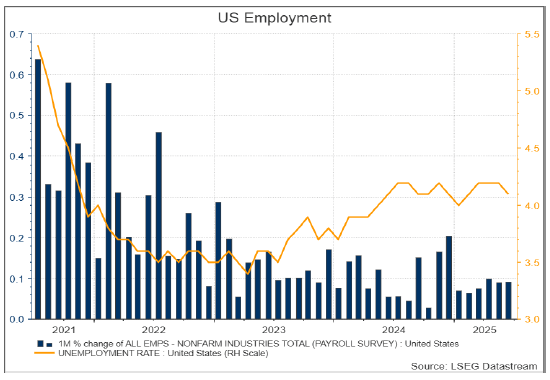 A stronger than expected jobs report combined with the passing of the fiscally expansionist Big Tax Bill to push US yields higher last week. 2-year bond yields rose from 3.75% to close at 3.88%. The key 5-year yield rose from 3.83% to 3.93 and the 10-year increased from 4.28% to close at 3.34% in thin trade after the 4th of July break. The expiry of the Tariff pause window on the 9th is likely to see a return of bond volatility. Currently the MOVE index is at lows along with the equity market VIX. It’s quiet … too quiet.
