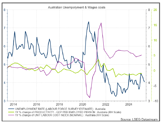 We view the unexpected strength of the Australian dollar since the Trump Tariff Day April 9 declaration as the light on the horizon for the inflation outlook. This is because in an economy with a free-floating exchange rate (flexible exchange rate as opposed to fixed) the transition path of monetary policy into the real economy is through the exchange rate. Due to the US trade policy changes Australia finds itself in a window where its currency is appreciating despite a worsening trade balance and RBA interest rate cuts. As Australia imports most of its finished goods the currency appreciation may, at least in the short term, push down goods inflation.