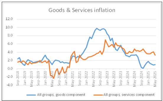 (2) Goods and services inflation shows a divergence with goods price increases back to long-term levels and services prices still at a high level. It is here that the recent Fair Work Commission minimum wage increase of 3.5% will begin to have impact from July this year.