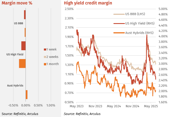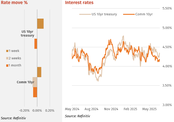 Bonds yields moved slightly higher last week partially tracking the US curve at the long end and reflecting some nervousness that the interest rate cut at the RBA July meeting may be deferred to August. In the previous week, the market with the heavy influence of the major banks was 100% priced for a 25bps cut but even the language from the major banks was softening by the end of the week. The comm. Gov. 10-year bond finished at 4.18% a rise of 0.06% for the week.