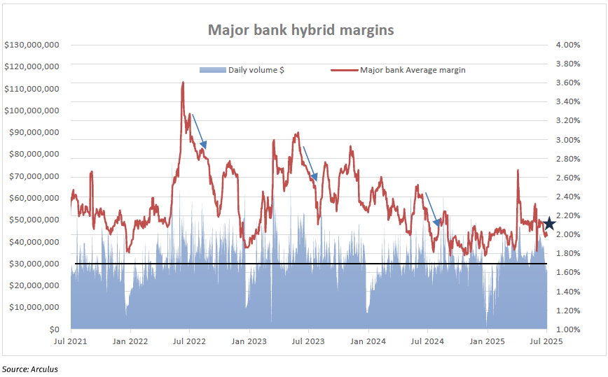 July tends to be a strong month for hybrids. This July may be no exception. After a strong rally in June where the average major bank hybrid margin fell from 2.32% to 2.00%, in this first week of July the average margin fell further to now be under 2%. The chart shows the average margin since June 2021. The arrows show the margin direction in Julys. The current period marked by the star appears to be heading this way. This effect is similar to that observed in Januarys – where portfolio buying enters the market and margins fall. Structural support is also evident. The hybrid market is shrinking, with few new issues expected in 2025 and beyond, aside from select insurance company hybrids or occasional bank issues. APRA continues to permit new bank issuance, but only as a like-for-like replacement of maturing hybrids.