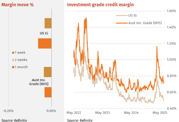 Australian IG credit was firm with major bank senior bonds finding demand over the week. The US holiday disrupted markets, shown by a quiet week in issuance with Rabo coming with a new 5-year bond and Suncorp a 12-month note. The Rabo spread set at +86bps well inside a previous 5-year at +93bps that has traded poorly in the secondary.
