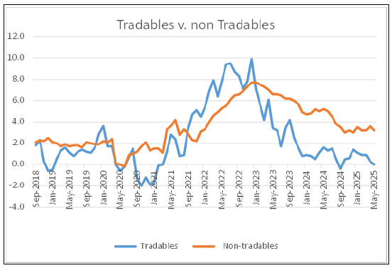 (1) Tradables inflation includes Household furnishings, clothing and footwear that have been consistently declining since the pandemic restrictions were lifted and the global supply chains were restored. Non-tradables inflation remains at a high level.