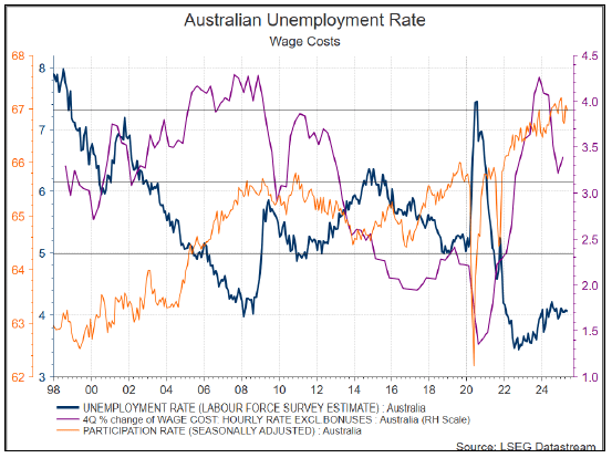 (6) Rising Unit Labour costs – In an Australian context where we have a central bank that strongly believes in the Phillips Curve Theory, (a belief that the government with changes to fiscal policy can control the unemployment and price outcomes) we can see in the chart below that higher inflation in the future is a certainty. Unemployment is well below the full employment level of unemployment -4.25% – while labour participation is near a record level and wages growth is now underwritten at a minimum of 3.5% due to the Fair Work Commissions 3.5% minimum wage increase as of the July 1, 2025. Consistent with this the RBA should have begun reducing monetary stimulus the moment that unemployment fell below 4.25%.