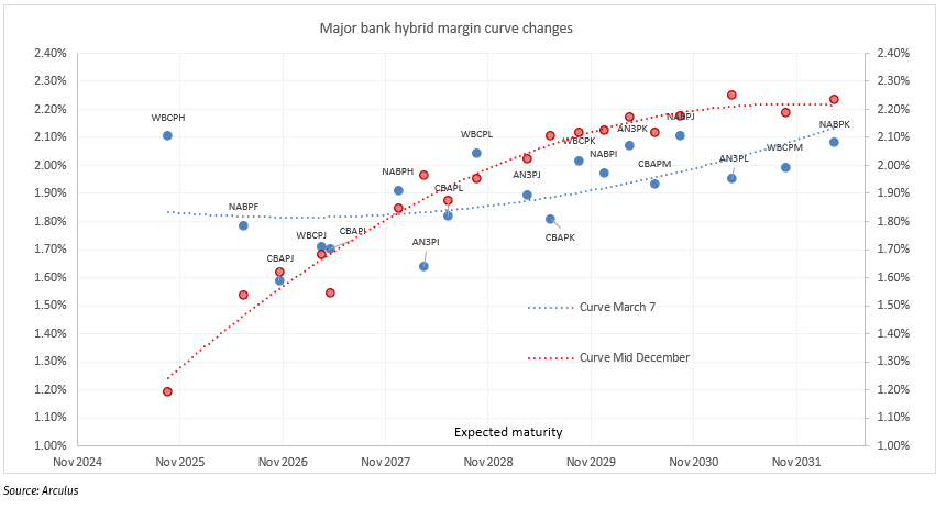CBA has until March 15 to announce intentions to call CBAPG which has an optional repayment date of April 15. Given a reinvestment offer would require more time than one month in the marketplace, it looks like CBA will simply repay as ANZ recently did with AN3PH. Note the AN3PH $930m face value is repaid on March 20. Similarly, the CBAPG $1.3 bn face value would hit bank accounts on April 15. These two redemptions should keep secondary hybrid spreads very firm into April/May. There are only three other hybrids with maturities in 2025: WBCPH, $1.69 bn in September and in December AMPPB ($275m) and MBLPC ($641m). In a sector that measures fairly vs sub notes and senior bonds, investors are mad to be giving up yields from major banks that have had their credit profiles improved by APRA’s actions. The chart below compared the current major bank hybrid curve with that in mid- December., just after the APRA news flow regarding cessation of hybrid issuance. The blue dots with labels are the current curve and the red dots the corresponding hybrids margins in mid-December. Note the curve changes. The average margin spread for each date was about the same, however short-term hybrids have risen in margin and longer dated bought. This was discussed above, reflecting investors selling for alternative products. Unless these products are funds with a lower risk profile and higher yield (like the Arculus Preferred Income fund), the trade is very mis-leading and gives up secure short-term yield.