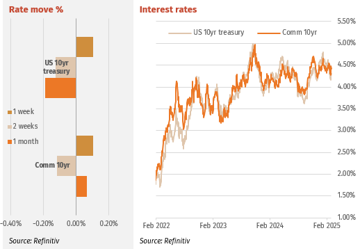 US bond rates reversed the recent trend over the past month after Chairman Powell mid-Friday indicated the Fed can be patient in determining its next course of action and that the economy was stable. This was despite an earlier softer payrolls report that had moved rates lower. At close Friday, the 10-year treasury was 4.30%, a rise of 0.10% for the week. The market had been pricing in three Fed rate cuts for 2025, a rise from only one cut expected in early February. This highlights the volatility of expectations which is displayed via the MOVE index (bond equivalent to the VIX) hitting post US election highs.