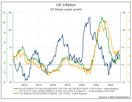 In the UK there is a correlation between rising money supply and rising inflation. Money supply growth since mid-2024 is now fuelling a rise in prices that will not be upset by the rise of the Pound to the USD because there is very limited trade with the US.
