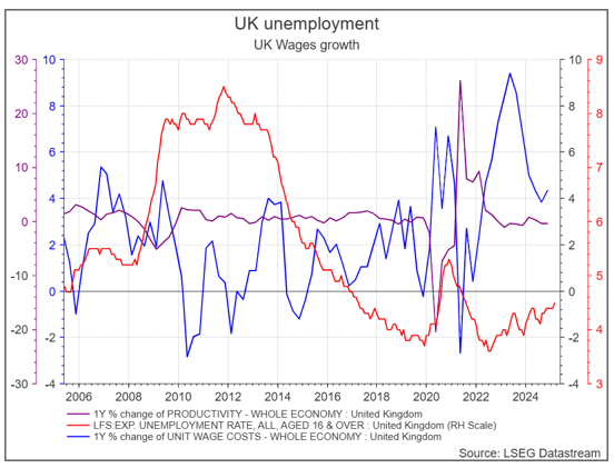 The recent rate cuts by the BOE reflect the degree to which unemployment has risen rather than the actual level. Some economists believe that every time the unemployment rate rises by 50bps it triggers a recession – because that is what has happened in the past. We would argue that the pandemic and Brexit distorted the employment readings, but that there is – with only a small lag- a correlation between the unemployment low points near 3.6% in late 2020 and late 2022 and a surge in wage costs 3-6 months later. We would argue that the UK is operating currently beyond full employment and that is why wages growth is above 4% while labour productivity is marginally negative (-0.302%).