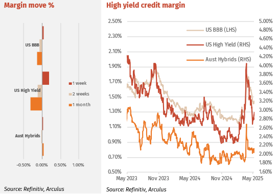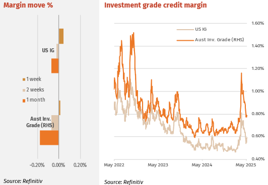 Credit markets weakened on the back of rising long bond yields, concern over the US’s credit rating and Trumps tariff threats to Europe. Margins ticked up a few points across the credit curve. Additionally, Trump’s tax-cutting bill weighed on credit sentiment. Cyclically exposed sectors have recovered in Investment Grade (IG) credits.