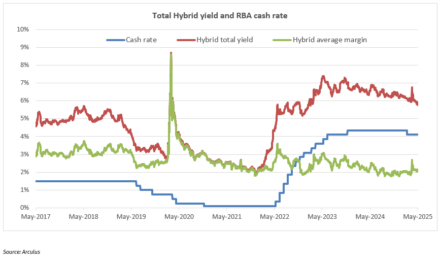 The RBA cut the cash rate last week by 0.25% to 3.85%. Total yield on hybrid securities—the combination of the cash rate and the hybrid margin—will decline. This is because hybrid yields are partly based on the variable bank bill rate, which closely tracks the cash rate. The 0.25% cut will reduce the total yield by the same amount. While the hybrid margin fluctuates daily and drives short-term yield movements, the cash rate exerts a broader and more sustained influence. The chart illustrates the RBA cash rate (dark blue) and the hybrid margin (green) since 2017. Their sum—the total yield—is shown in red and has closely followed changes in the cash rate, particularly during the sharp rate hikes between April 2022 and November 2023.