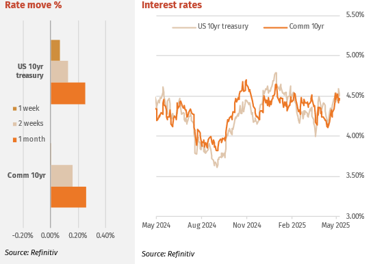 The key 10-year Comm. Gov. bond yield tracked higher with US bonds for a weekly high of 4.51% but finished the week in NY at 4.38%. This discount to the US 10 year may be the result of funds flowing out of USD into AUD in the short term.