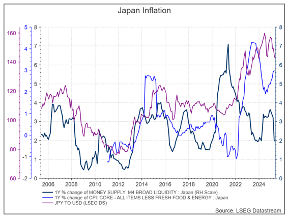 Secondly, Japan where it is the Yen weakness driving inflation primarily. Japan imports a lot of its inputs to its manufacturing sector so is vulnerable to a change in the exchange rate. Core inflation in Japan is once again increasing quickly, and this is driving bond yields in Yen higher.  It could be easily argued that the BOJ does not need to tighten Monetary Policy again as broad money growth has declined considerably.