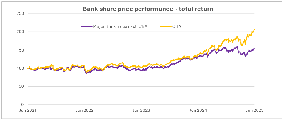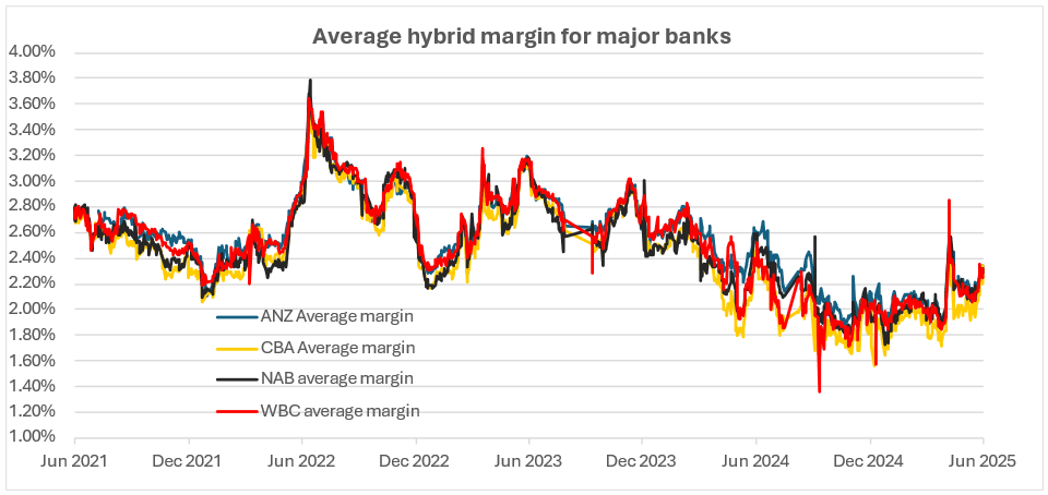 Not just Australian, but global investors are looking at the performance of CBA and its eye watering PE ratio, especially for a plain vanilla mum and dad mortgage provider. CBAs performance has outpaced the other three major banks as shown in the first chart below, especially since June 2024. What does this mean for hybrids? If hybrids were a true “hybrid” security then the strong equity performance, especially by CBA, should show up in hybrid pricing. However, hybrid margins are well off December lows.