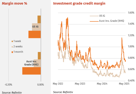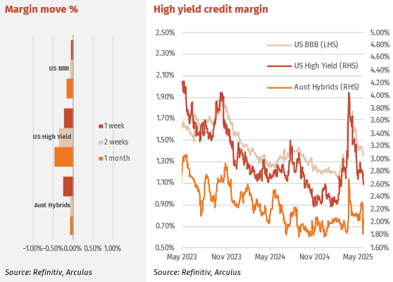 Global High Yield (HY) markets rallied with US equity markets showing some signs of steadiness. As with IG, issuance has been strong with a 12-month record reached last week. HY companies are raising before tariff and production costs are evident and any softening in profits. Issuing now, whilst balance sheets are strong and default rates low, makes sense. Further, the margin curve is quite flat giving companies an incentive to do longer-term issues.