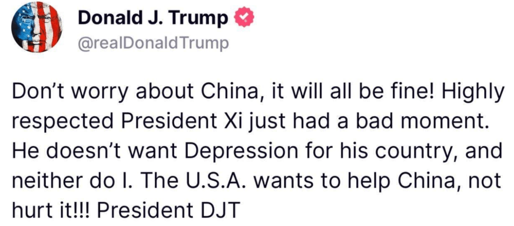 The markets may be volatile this week as the news is fully digested across global markets of how real President Trump’s latest threat is. Also keep in mind the U.S. bond market is closed on Monday, which means the reaction in the rates market will take another day. As always, both the U.S. & China has left some room for de-escalation – China on Sunday and now President Trump with this:
