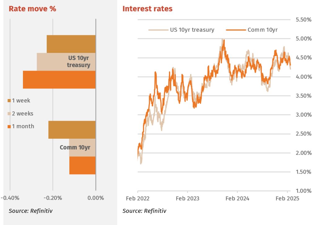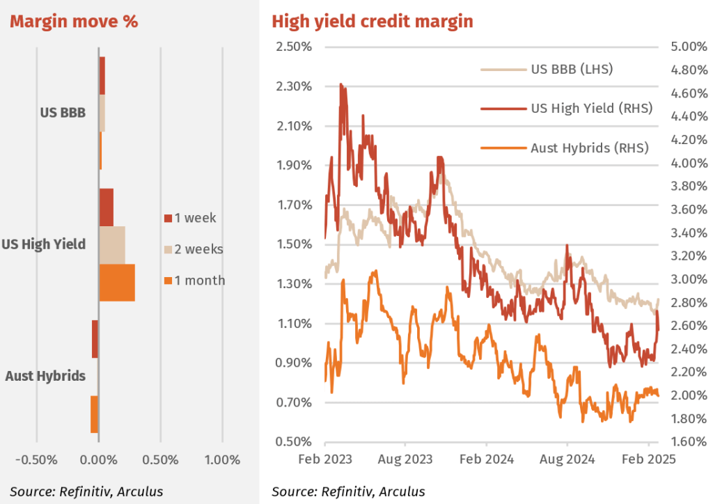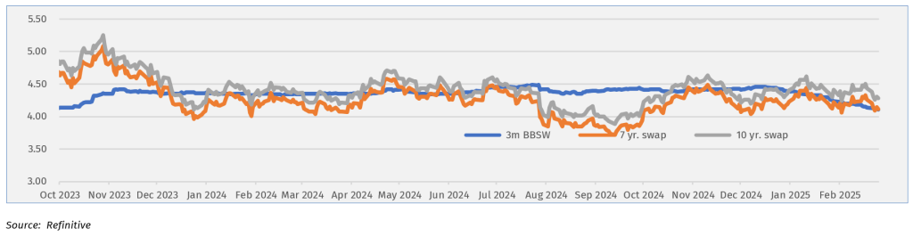 US yields fell over the past week with weak economic data, a steady inflation print, comments from the Treasury secretary stating lower yields are wanted and a flight to safety as investors switched from equities. The market consensus that the economy will contract is considered in the Macro Commentary section below. The treasury secretary also indicated issuance will continue at the short end of the curve rather than long bonds as the market was expecting with Trump. This will reduce the number of long bond auctions. As a result, the 3m-10 yr yield curve has inverted, however this may also reflect a pause in the Feds rate cutting. US 10 yr. treasuries fell to 4.20%.