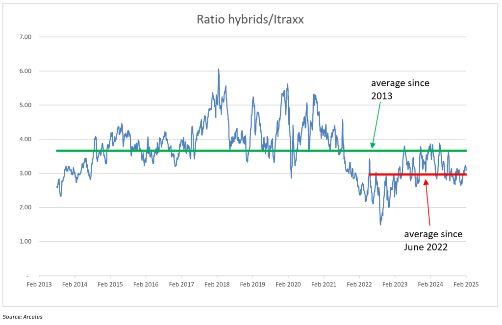 We often look at hybrids fair value vs. the iTraxx index, a measure of the top 25 Aust. corporate senior bonds margins. A simple ratio of the average major bank hybrid margin to the iTraxx index reveals relative value. The chart below goes back to 2013. The average level since that time is shown (green line). Peaks in the ratio signal hybrid margins high relative to Investment grade credit. Troughs the opposite. Currently hybrids look slightly expensive over this long timeframe (i.e. last ratio compared to green line). However, looking at the recent period since June 2022, when cash rates were rising strongly (as shown by the red line), hybrids look slightly cheap. Given the recent APRA changes have taken some risk out of their repayment probability, comparison to this shorter timeframe has good merit. On this basis hybrids now look good value, not screamingly cheap but definitely not expensive as in 2023.