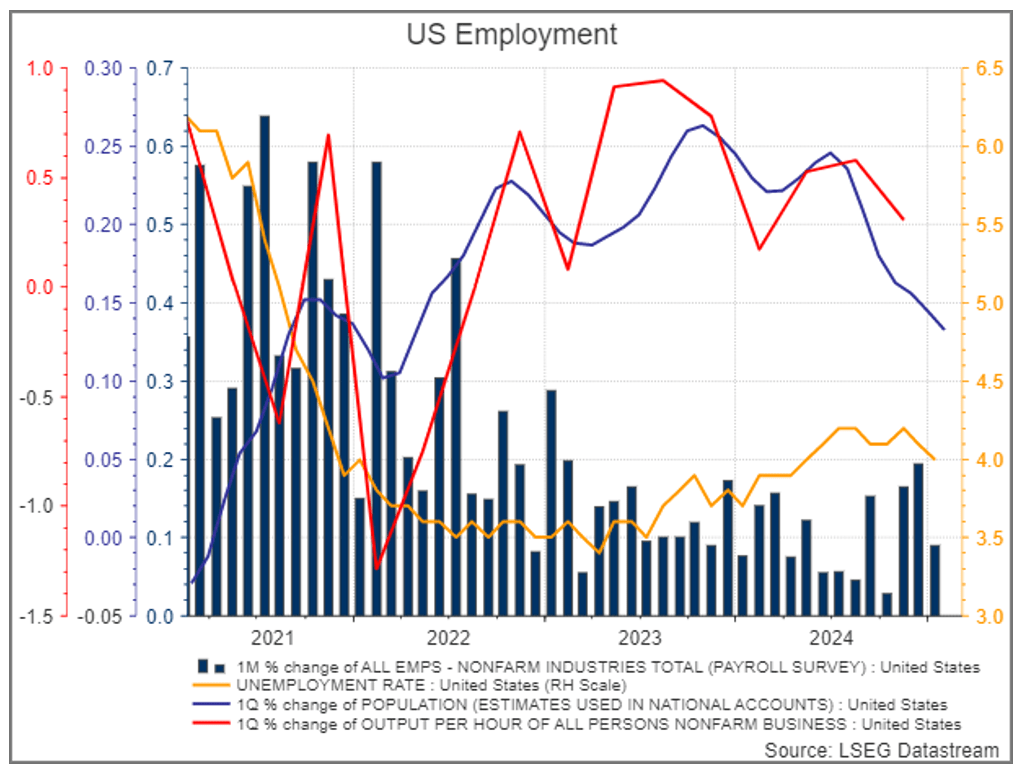 - Monthly non-farm payrolls have weakened to @165,000 from over 200,000.