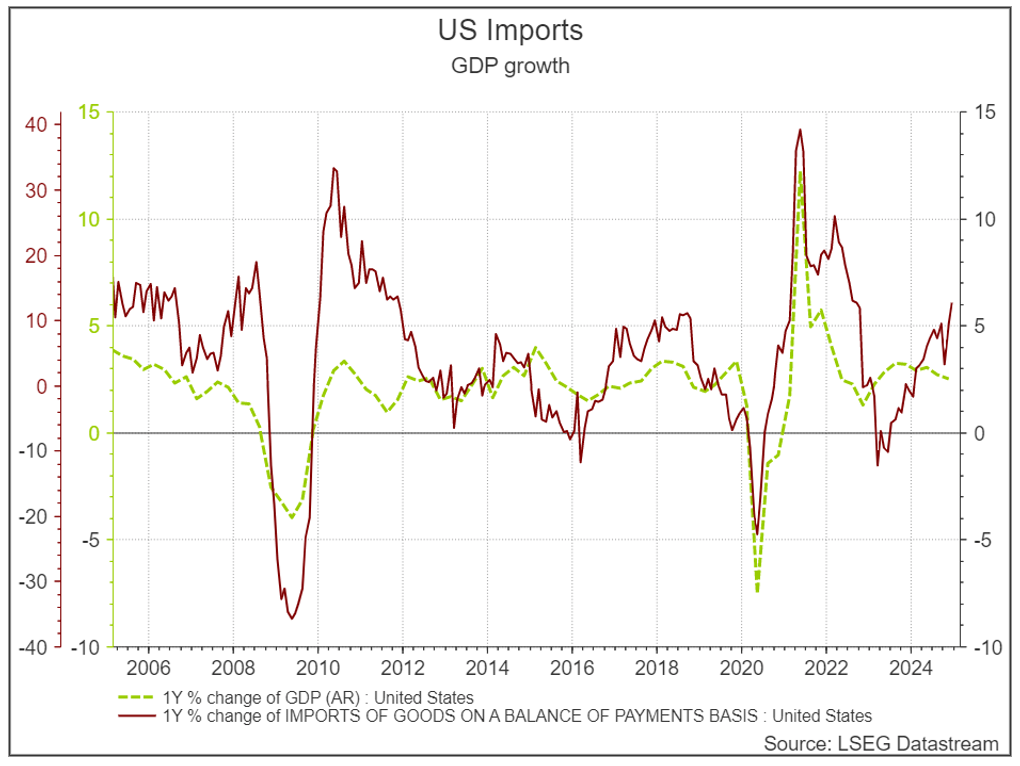 One of our favourite forward indicators – often by just one quarter- is US import growth. The track record of this indicator over the past 16 years is very strong with a decline in import quarterly growth proceeding a decline in GDP growth. Although there are always a lot of factors of work in the US economy it seems unlikely that with such strong import activity over the past 12 months and then the tariff driven surge in January that US GDP will show a decline in the March quarter. In fact, based on this indicator alone, the US economy may about to see a surge in growth. The reliability of this indicator and the decline in imports in the first quarter of 2024 may have been one of the signals that the US Federal Reserve relied upon when it cut rates by 50bps in September of 2024.