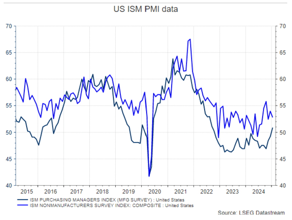The ISM PMI data is often misrepresented and misused by economists & strategists that are struggling with conflicts of interest. The Purchasing Managers Index is a forward indicator of private sector purchasing by 6-9 months. Way back in mid-2023 (apparently now ancient history) the market was 100% convinced that the US economy would enter a recession in the March quarter of 2024 because both the ISM PMI Manufactures Index was below 50 (indicating a contraction beginning in the March quarter of 2024) and the US benchmark curve had turned inverse. Historically this combination of signals had a 100% success rate. At the time we argued that a recession would not occur and that these signals had been distorted by the nature of the pandemic disruption.