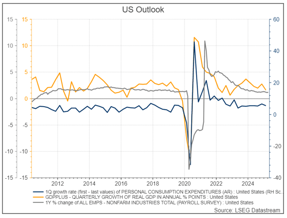 The US reported a 0.3% contraction in its quarter-to-quarter GDP for Q1 2025. The decrease in the first quarter is driven by an increase in imports, which are a subtraction in the calculation of GDP, and a decrease in government spending. Data releases showed that pre-tariff imports increased by 41.3% in the first three months of the year. Imports soared to $346 billion in March, which consequently led to the widening of the trade deficit as it reached $163 billion. Consumer goods led the surge in imports, with significant increases in automotive vehicles and capital goods. The Trump Administration’s fiddling here on tariffs is only distorting the markets in the very short term and the actual impact on consumption and GDP growth in aggregate may be tiny.