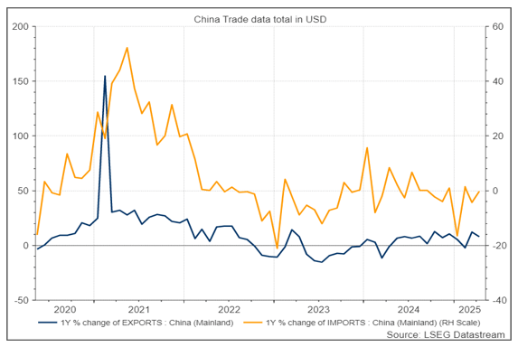 The China import and export data, released last week is informative. China’s April trade data beat market expectations and seasonality. In USD terms, exports rose by 8.1% y/y and imports decreased by 0.2%, both much higher than market consensus. On a monthly basis, China’s exports rose by 0.6%, outperforming the average month-on-month growth of -0.4% recorded between 2022 and 2024.