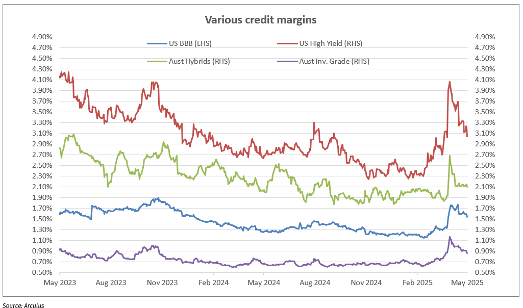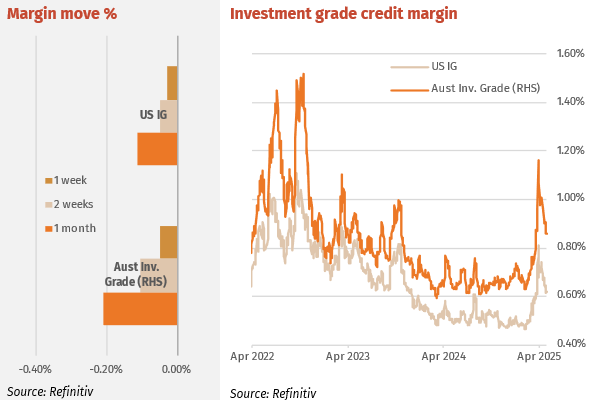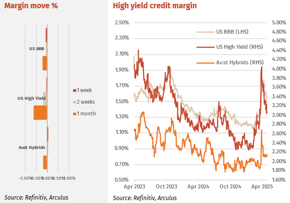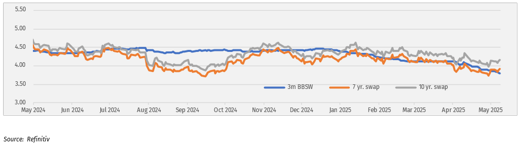 The eerie calm that spread over all global credit markets may well prove to be a false dawn. The corporate credit market has re-opened with tepid buying in the secondary market returning. ANZ issued a 12-month senior and NAB a 3-year senior bond quickly after reporting results. The choice of tenor kept 3-year margins at 74bps and 4-year at 82bps for other major bank seniors. The 5-year margin is now into 85bps and looking relatively expensive. Tier 2 bank sub debt was well sought after all week with spreads on the Kanga T2 coming into near the margins prior to the Liberation Tariffs in early April. Aurizon issued $250m Senior rated BBB- at +280 bps on Friday. This issue had a huge bookbuild and priced well inside the +300bps valuation suggests.