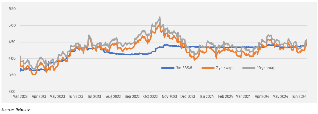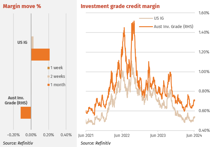 Australian credit markets were quiet despite a rise in interest rate volatility. The run into the end of the Financial Year saw little issuance except for a Bendigo Bank 1-year floating rate senior bond at BBSW+ 0.60%. John Deere Financial (rated A+) raised A$450m from a 5-year MTN 5.097% 2029 fixed rate bond at a margin of 1.0%. Pioneer Credit raised $55.5m of a 4.5-year unrated and subordinated bond at BBSW+10.50%.