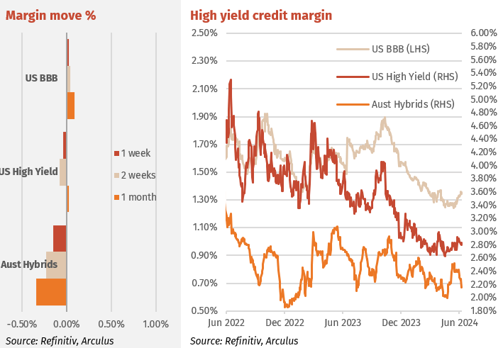 Hybrid margins fell over the week by 0.15%, the average major bank hybrid margins now at 2.16%, not too far from the recent low of 2.00% in mid-May just prior to the NAB issue. Most major bank hybrids were stronger except for shorter-dated issues such as AN3PH and CBAPG. In the middle of the curve CBAPI, AN3PI and WBCPL all performed strongly. Outside the major banks, nearly all other issues also performed well with the exception of BENPH and CGFPC. Issues potentially due for reinvestment such as the short-term BOQPE and MQGPC also saw strong demand.
