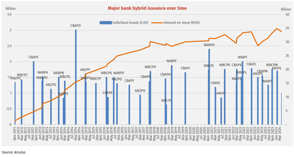 Major bank hybrid issuance is active with all major banks issuing each year and sometimes more than 1 issue in a 12-month period. The chart below shows issuance since 2011 when the Basel III hybrids were first issued. It took a good five years for the issuance to reach a stable level, although there were several old-style issues still in place up to 2015, however these did not equal the volume gap. Since 2017 the total on issue has been about $32 billion with an increase in 2024 now to $35 billon. Prior to 2024 the steady state was simply achieved by replacement issues at the first optional repayment date, these typically of roughly the same size. However, in April 2024 CBA did not replace the CBAPG issue. Conversely NAB issued out of cycle, although only $1 billion, however it was the second NAB issue in 8 months. CBA has not issued since May 2023. A pending APRA paper re hybrid structure may be to blame.