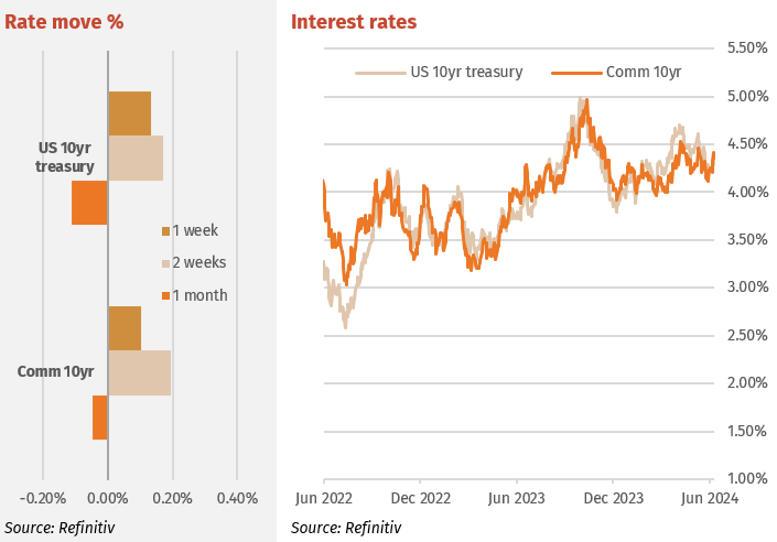 Wednesday’s dramatic jump in bond yields reflected the market realisation that Australia now has cost push inflation and more importantly, it has seen that the energy rebates in Tasmania did not have a sustained impact on the CPI reading. The Australian 10-year is now trading a slight premium to the US 10-year, and we see a risk that this will widen out further in the months ahead. Commonwealth Gov. bond rates were higher across the curve by 0.06 to 0.16%.