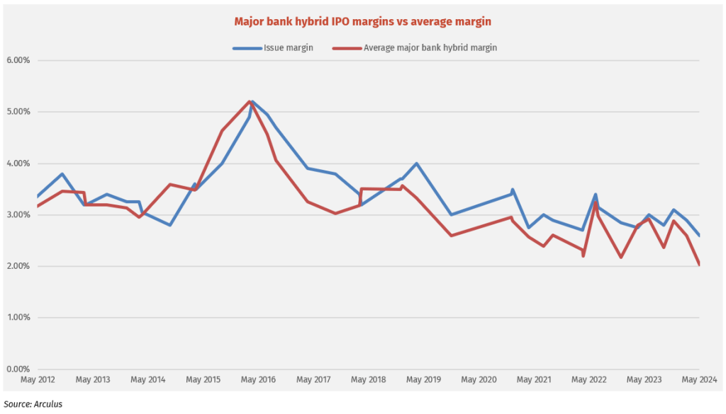 For completeness the second chart shows the issue margin from the securities in chart 1 vs the average hybrid margin at the time, noting that the average margin typically represents about a 5-year maturity whereas new issues are usually 6-7 years in expected length. As shown, the issue margin closely tracks the average margin. New issues are set vs market trading margins at the time.