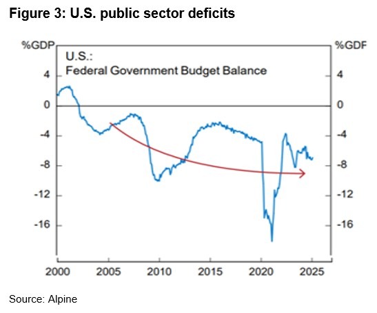 Global fiscal thrust. As we have been arguing for some time that, all else being equal, if governments continue to persist with aggressive spending plans, then that is likely to be supportive of corporate profits and therefore equity markets. Fiscal deficits across key regions – the U.S. (see figure below), Europe, China, Japan – have increased over the recent years. More specifically, the U.S. government has been running budget deficits of 6-7%.