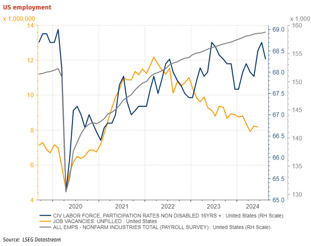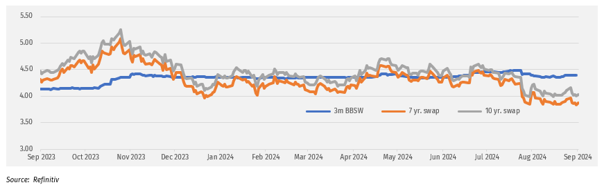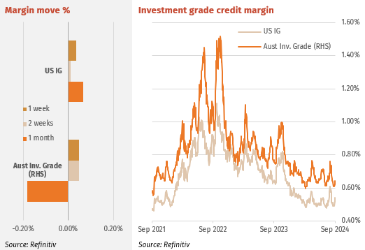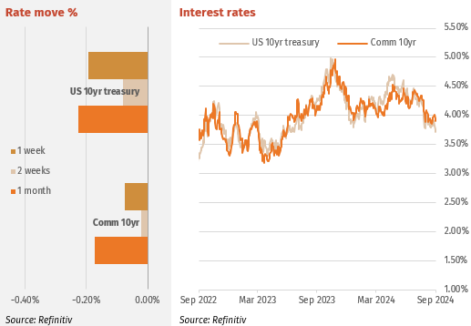 US rates fell over the week with a volatile equity market and Friday’s August payrolls report failing to give a clear signal as to the size of the upcoming Fed rate cut due 18 September.  However, subsequent to the disappointing payrolls data, the market is now doubting a 50bp cut will happen.