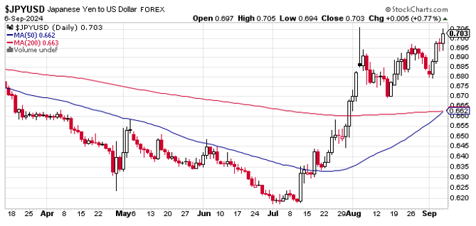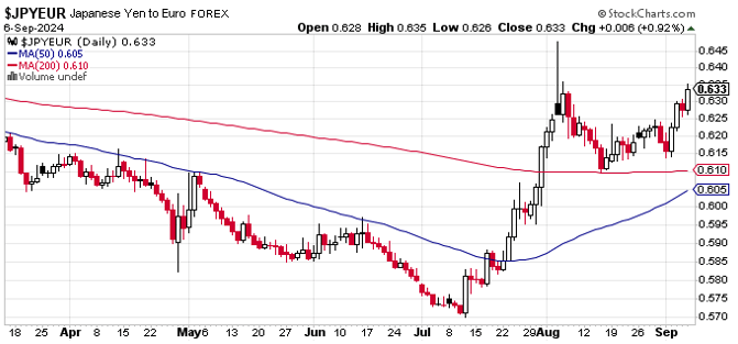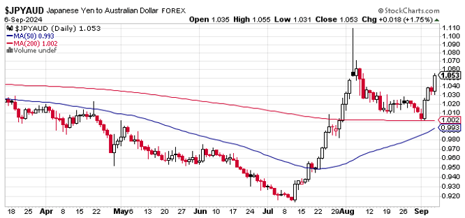 The following exchange rate charts show that the Yen is reaching towards the same levels that were last seen on 6 August when the Yen Carry Trade unwinding hit all global markets.