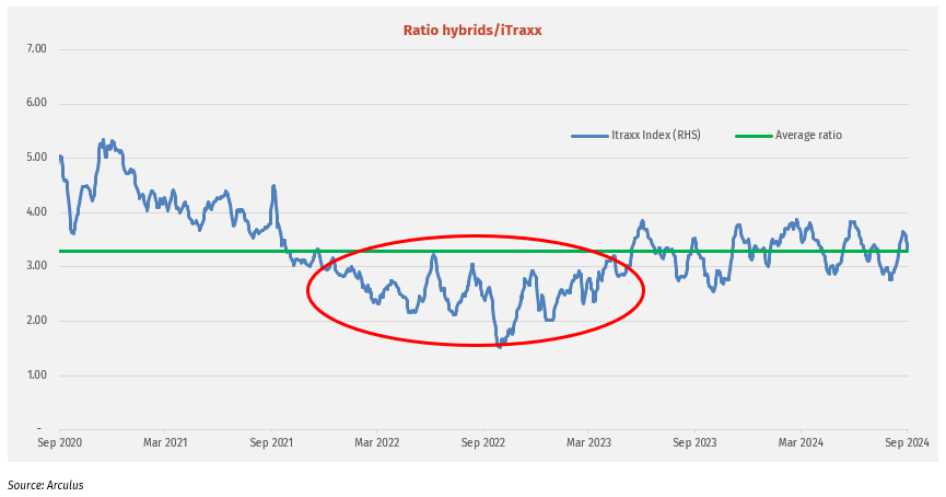 Right now, the average major bank margin has dipped below 2%, the target we have mentioned in the past month subsequent to the Macquarie Group issue. The first chart shows this is not far from a key minimum level post Covid (the environment where interest rates have risen resulting in increasing hybrid yields). The lows in the chart marked 1 and 2 were at December ends when hybrid margins do tend to rally because of illiquidity. Low 3 in mid-July 2024 was after a period of little issuance. As we know, hybrid margins are in part driven by credit markets. The second chart shows the iTraxx index over the same period. This index, representing the top 25 Australian companies’ senior bond margins, is the best daily representation of the senior Australian credit market and despite only being 24% weighted to banks, is a good bellwether for hybrids. The iTraxx index chart shows a similar pattern to hybrids (or to be accurate, hybrids are similar to the iTraxx). The current index margin is close to lows, having bounced of the low at the end of August.