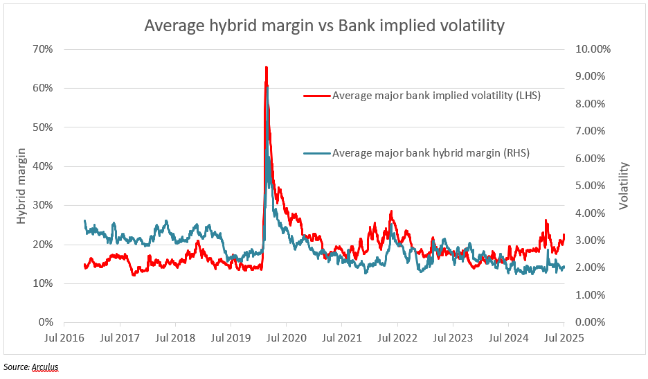 However, the most recent data points show a potential divergence. Implied volatility has recently surged, suggesting growing market nervousness—possibly linked to the 3.54% weekly decline in a major bank index and a significant 10% drop in CBA alone. Yet, hybrid margins have remained largely stable. This disconnect may be short-lived or reflect a shift in market structure, but it is noteworthy given that in past episodes similar volatility spikes led to swift repricing of hybrids. Whether this lag is due to investor complacency, structural buying, or a delayed reaction remains to be seen, but it will be important for hybrid investors to watch if margins catch up to the volatility move. A lead indicator will be the continued weakness in bank share prices.