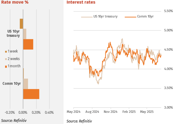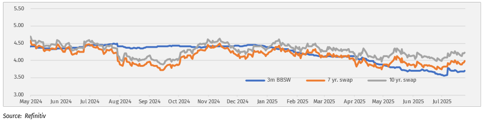 Yields finished steady with the week before due to a lack of new data. This week’s CPI data will be the focal point for the markets. Governor Bullocks speech last week dismayed the banks that have been hoping and pricing for an August rate cut when she pointed that last month’s tick up in the unemployment rate was not consequential and that the expiry of the electricity subsidies will mean inflation will begin rising again shortly.
