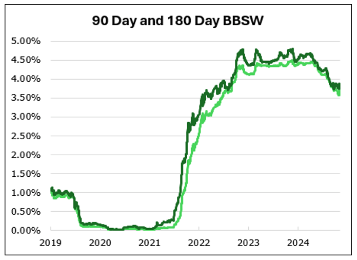 The 90-day BBSW rate surged 19bps to 3.76% after the RBA decision to leave rates on hold at the July meeting and finished the week at 3.72%. Some market participants are still wanting to believe that a rate cut will occur in August, but we strongly believe that expiry of the large electricity subsidies (State and Federal combined) will see inflation begin to rise from July onwards. This has been the case in the UK already and is beginning to show up in EU Area data.