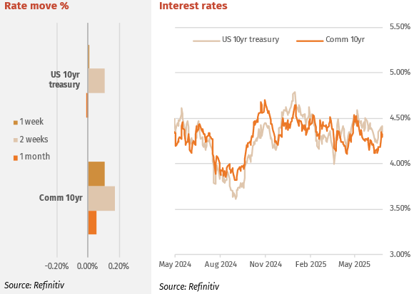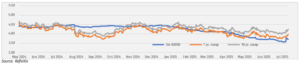 A combination of rising US yields and the RBA’s decision to hold rates pushed Australian bond yields higher last week, particularly at the short end. The 2-year climbed 0.14% to 3.434%, the 5-year rose 0.12% to 3.633%, and the 10-year increased 0.14% to 4.33%. These moves reversed the downward trend seen since mid-May, with yields now well above late-June levels, the 10-year now in the middle of its 9m range.