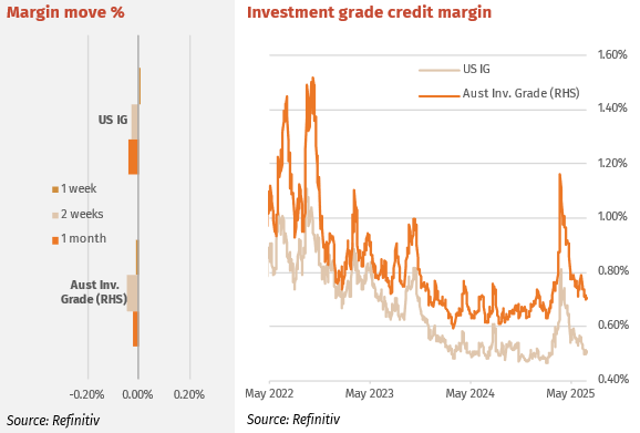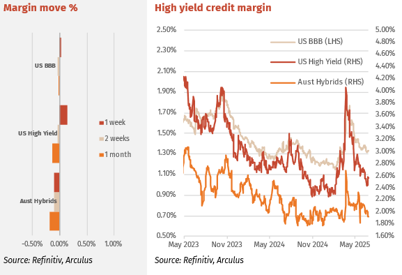The strong run in High Yield (HY) markets paused last week despite good equity markets. The re-igniting of tariffs caused some dislocation in HY sub-sectors. Retail and energy sectors were weak whilst telecom and automotive sectors were strong. A new entrant to the global HY market last week was Nissan Motor. Downgraded to Junk in February, Nissan is now a BB credit. The Nissan US senior unsecured 5, 7 and 10 bonds were issued at margins of 3.55%, 3.60% and 3.76% respectively over treasuries.