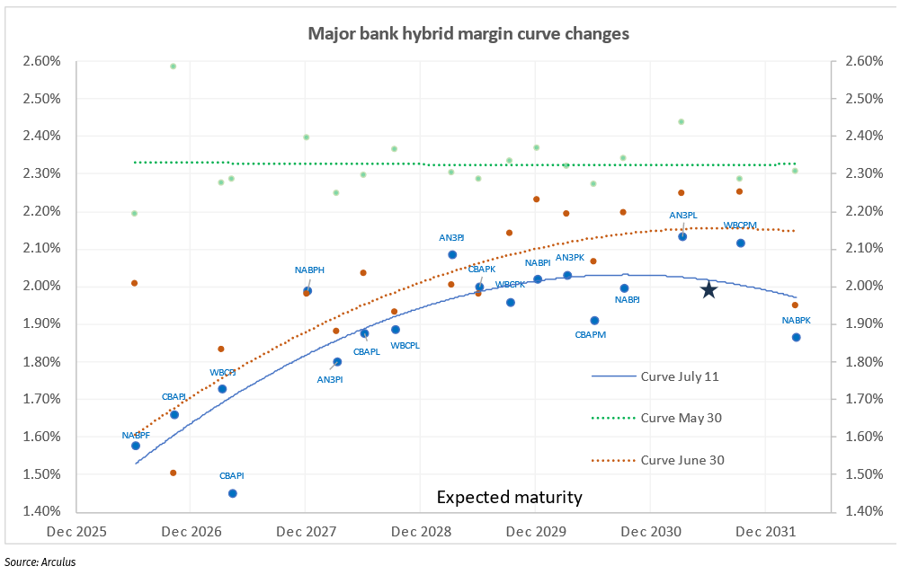 As noted in recent weeks, hybrids have continued their strong rally. The chart below illustrates the movement in margins for major bank hybrids since May 30, with each curve reflecting a different date. At the end of May, the margin curve was unusually flat—an atypical structure for hybrids, as it offered little in the way of term or risk premium.