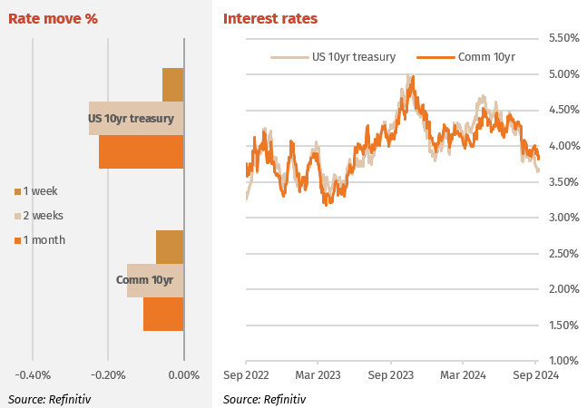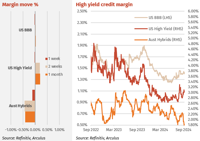 Investment grade (IG) primary market issuance last week was a large US$38.225bn and average credit spreads tightened 2bps to 99bps. YTD credit spreads have tightened only 5bps. So much of the buying demand will relate to an expectation in the equity and credit markets that the Federal Reserve will cut rates by 50bps in the week ahead. Of note was the Moody’s announcement that Boeing’s rating is now on review for possible downgrade to junk (below BBB-).